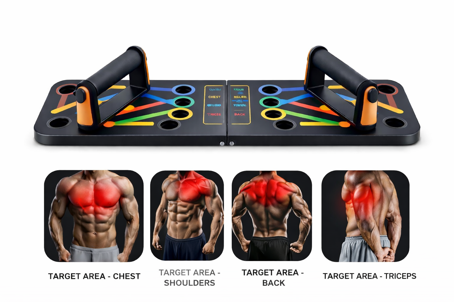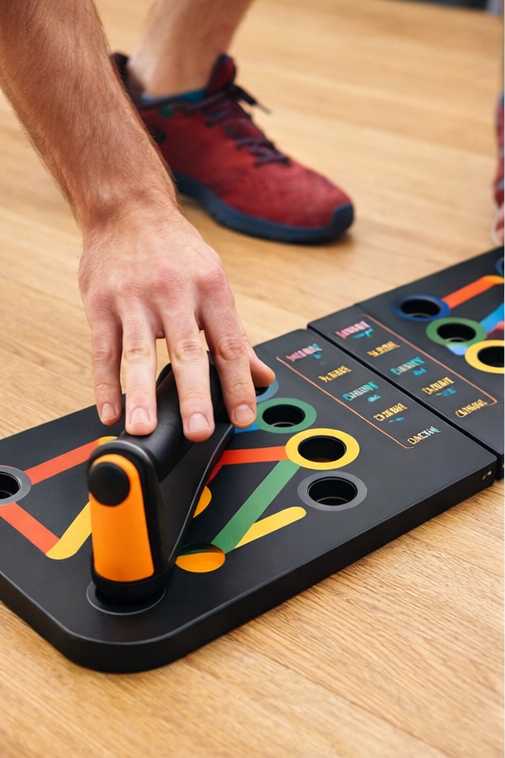 push-ups, focusing on the selected muscle group. The ergonomic design of MyPushFitBoard helps you maintain proper alignment, reducing the risk of injury while maximizing the effectiveness of each rep. As you progress, switch up the handle positions to keep your workout dynamic and challenging, ensuring you're always pushing your limits.